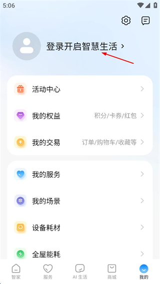 2、在個(gè)人頁(yè)面點(diǎn)擊登錄開(kāi)啟智慧生活,進(jìn)入登錄界面。