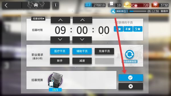 4、在選擇好詞條和招募時(shí)間后,可以通過(guò)點(diǎn)擊下方打勾按鈕,開(kāi)始等待時(shí)間招募。