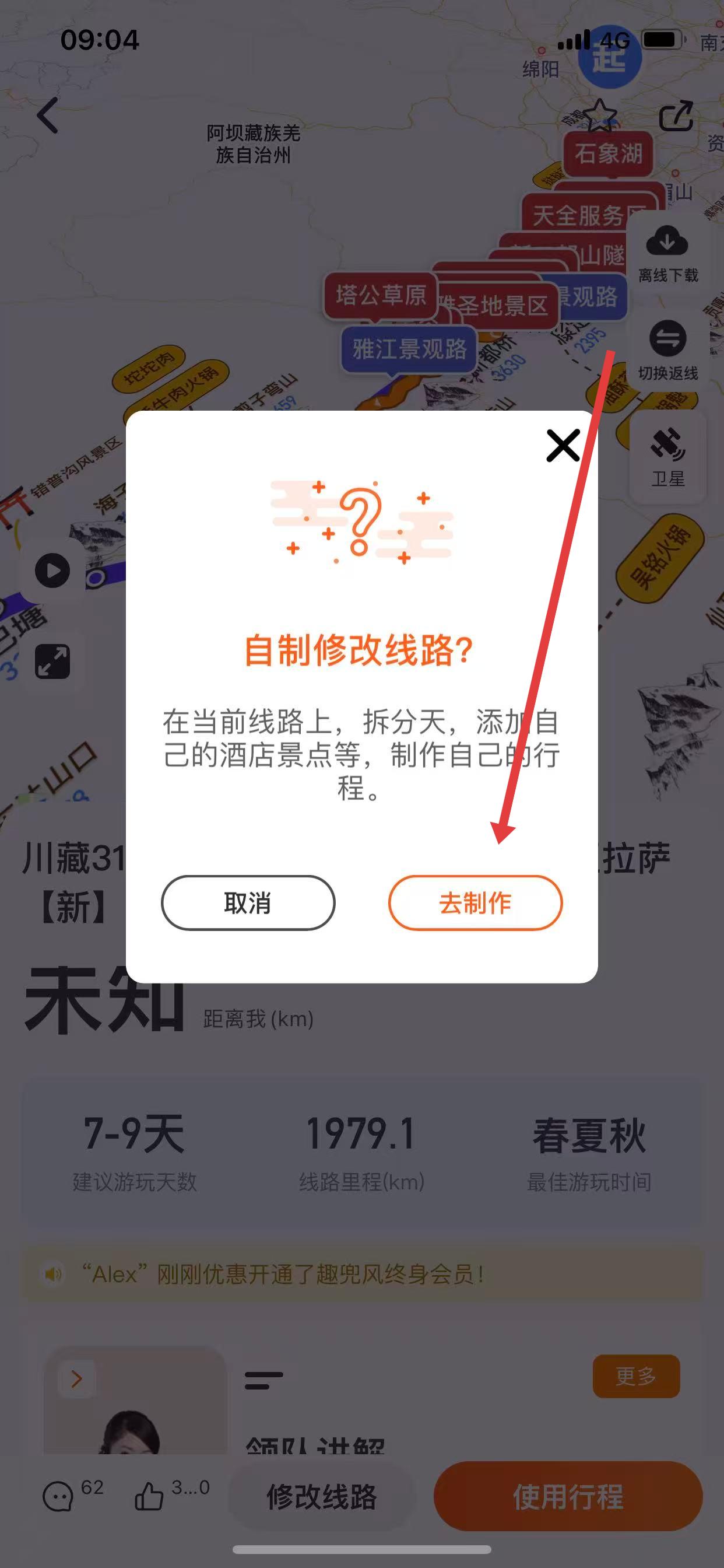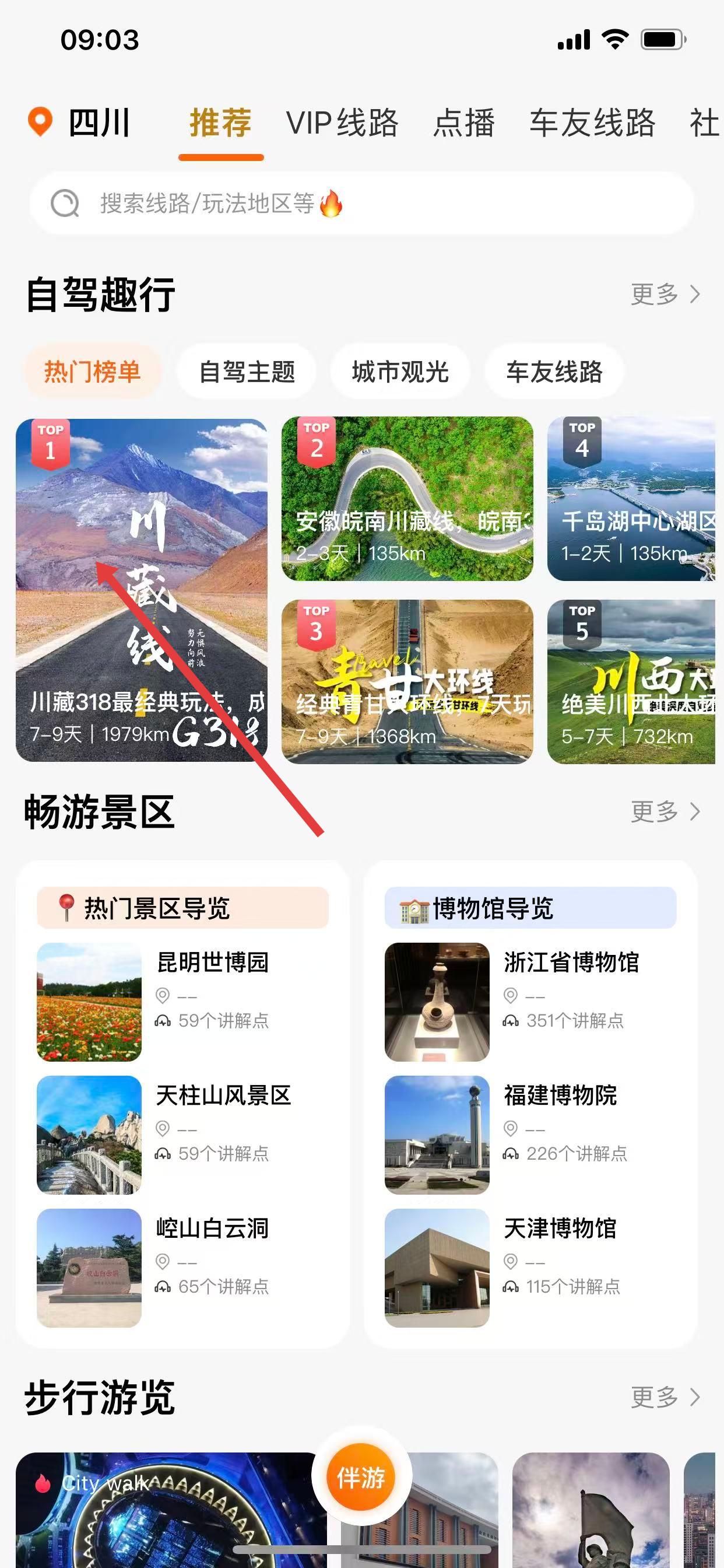 1、打開趣兜風(fēng)APP,在自駕趣行推薦區(qū)域,找到想要修改的他人線路,點(diǎn)擊進(jìn)入該線路詳情頁面。