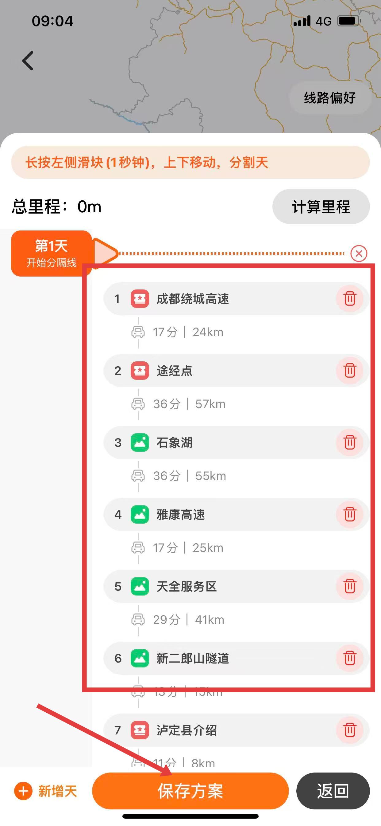 4、對線路中的行程點(diǎn)等內(nèi)容進(jìn)行調(diào)整,點(diǎn)擊保存方案,即可完成對他人線路的修改并保存。