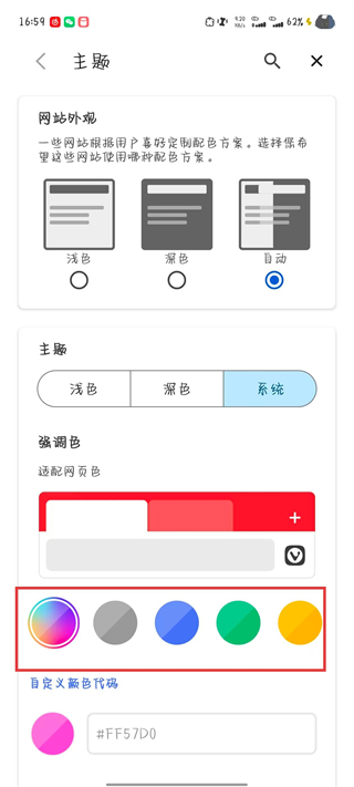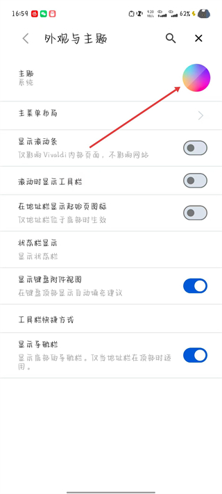 4、在外觀與主題頁面,點(diǎn)擊主題右側(cè)的彩色圓形圖標(biāo)。