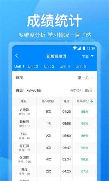 支持背單詞、備考訓(xùn)練、繪本、口語等成績(jī)統(tǒng)計(jì)。