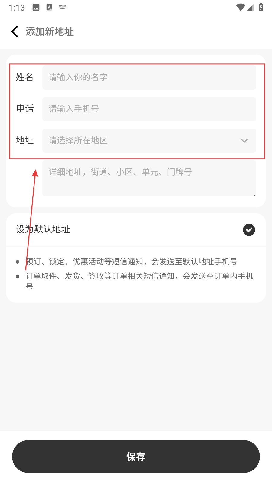 4、在編輯頁面中,依次輸入姓名、電話,選擇所在地區(qū)并填寫詳細(xì)地址,也可勾選設(shè)為默認(rèn)地址,最后點(diǎn)擊保存按鈕。