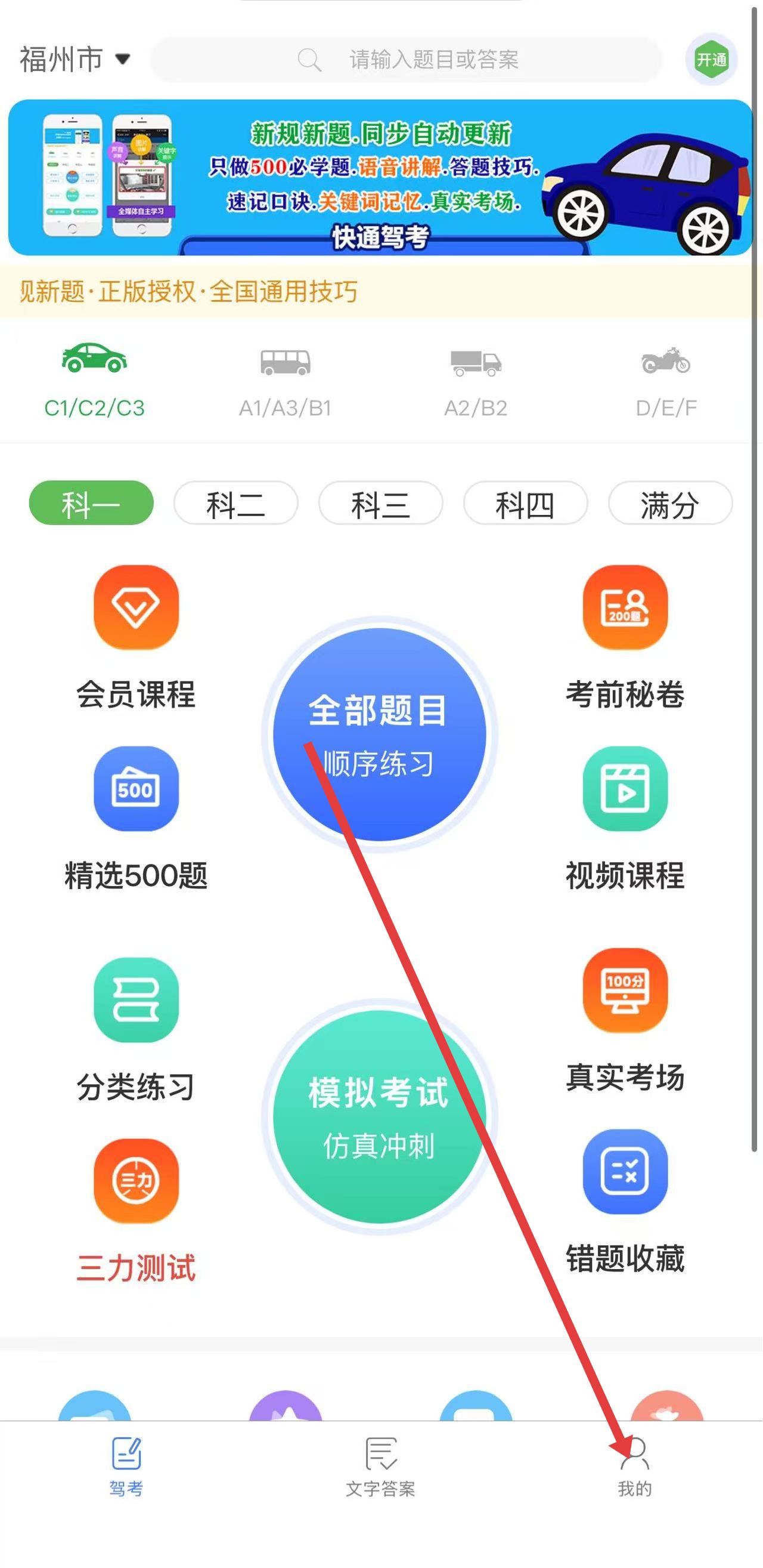 1、打開快通駕考APP,點(diǎn)擊底部導(dǎo)航欄中的我的,進(jìn)入用戶中心頁(yè)面。