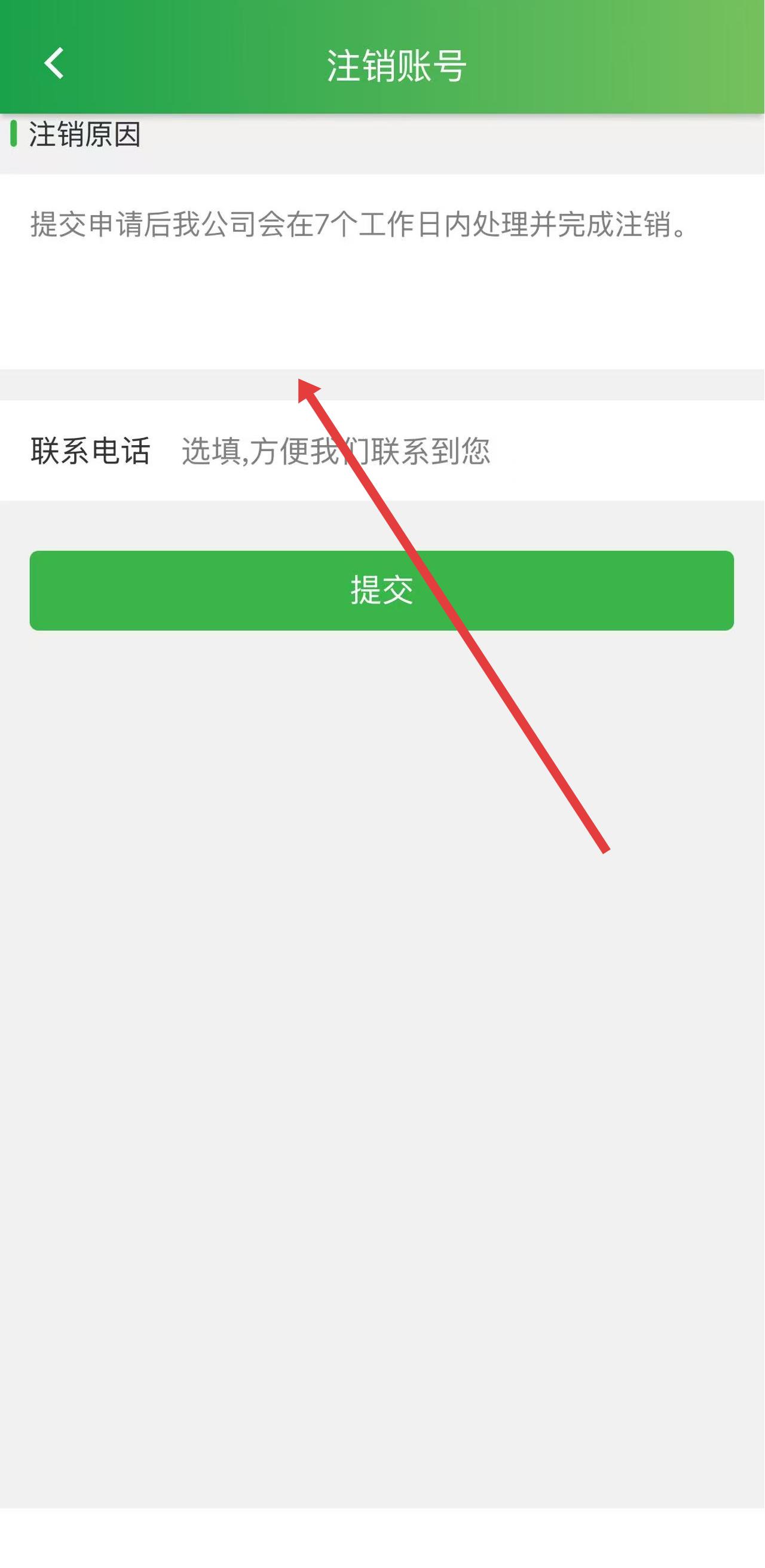 4、在注銷賬號(hào)頁(yè)面,填寫注銷原因,可選擇填寫聯(lián)系電話,然后點(diǎn)擊提交,等待7個(gè)工作日內(nèi)完成注銷。