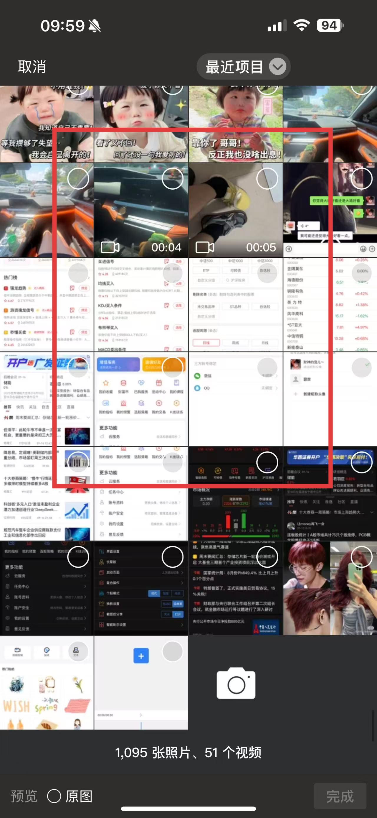 3、從手機(jī)相冊(cè)里勾選需要添加文字的視頻,然后點(diǎn)擊完成按鈕,導(dǎo)入視頻。