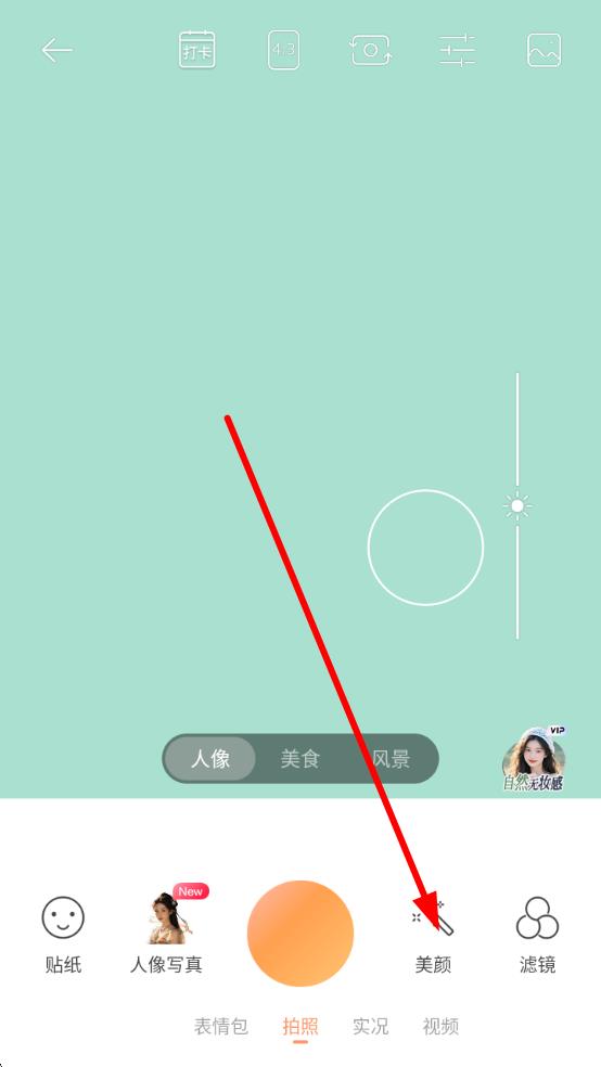 2、在拍攝界面,點擊下方美顏按鈕,進(jìn)入美顏設(shè)置頁面,可對膚質(zhì)、臉型等進(jìn)行調(diào)整。