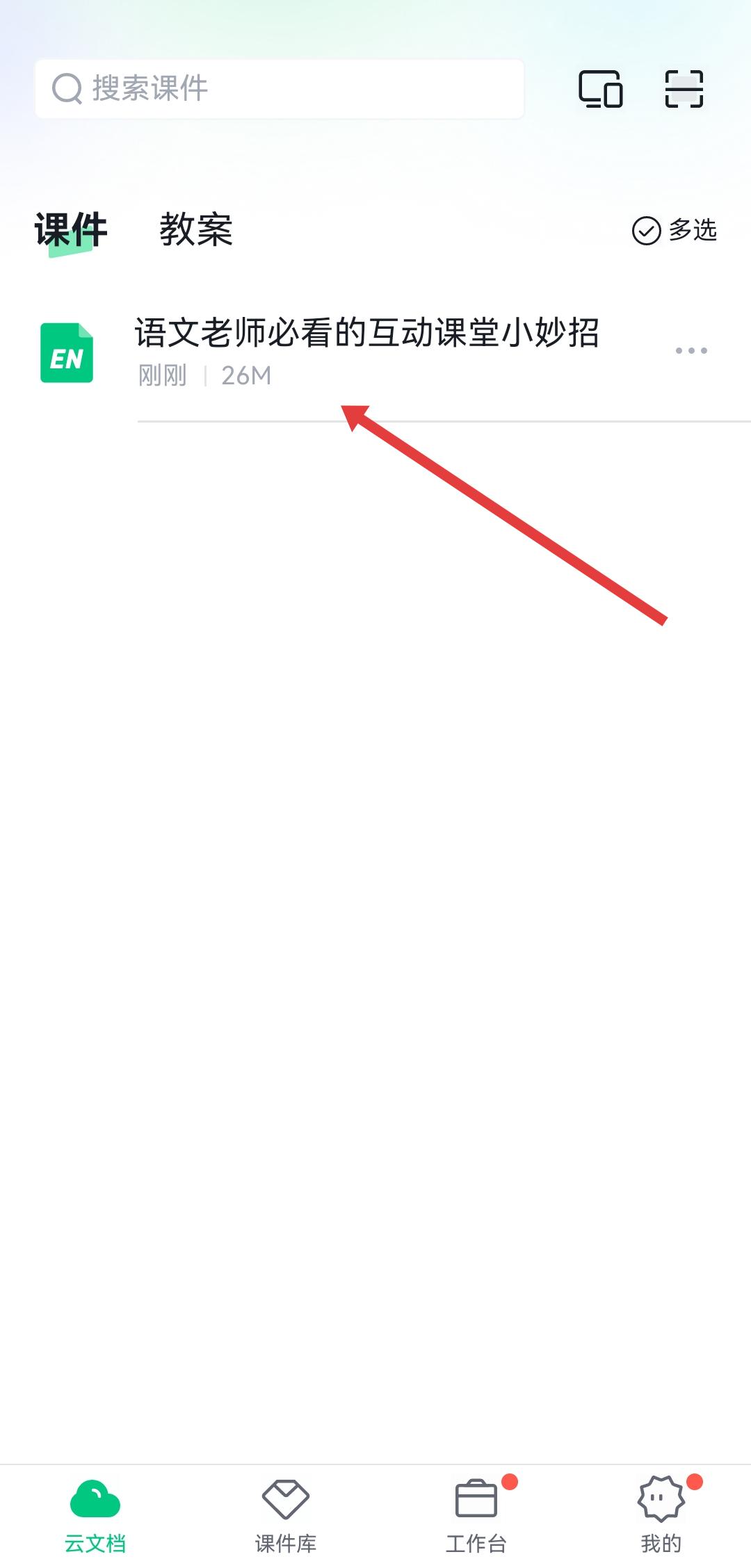 1、打開希沃白板APP,進(jìn)入云文檔的頁(yè)面,點(diǎn)擊需要要授課的課件。