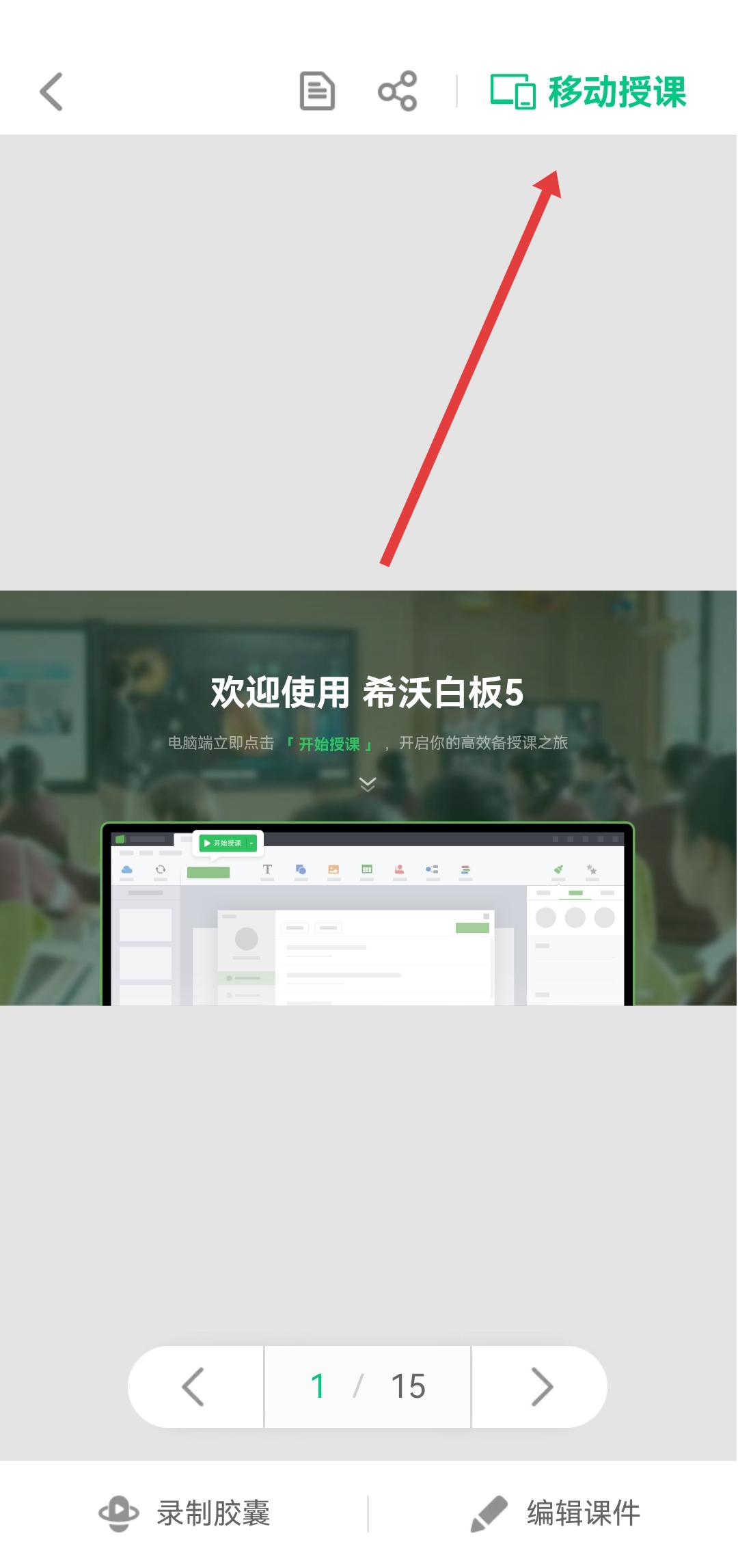 2、進(jìn)入課件的詳情頁(yè)后,我們這里需要點(diǎn)擊右上角的移動(dòng)授課按鈕。