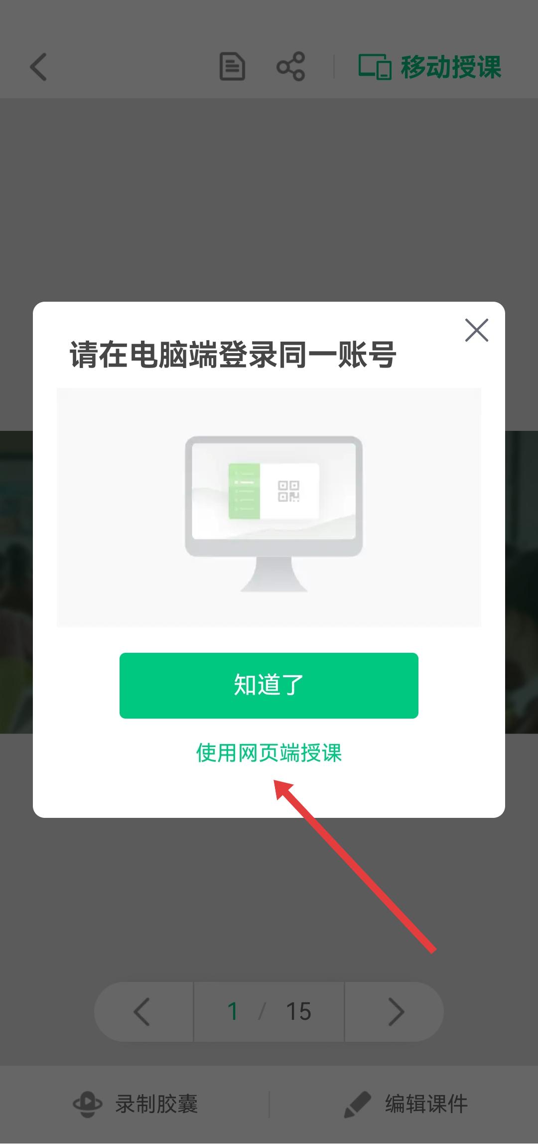 3、在彈出的請(qǐng)?jiān)陔娔X端登錄同一賬號(hào)提示框中,點(diǎn)擊使用網(wǎng)頁(yè)端授課。