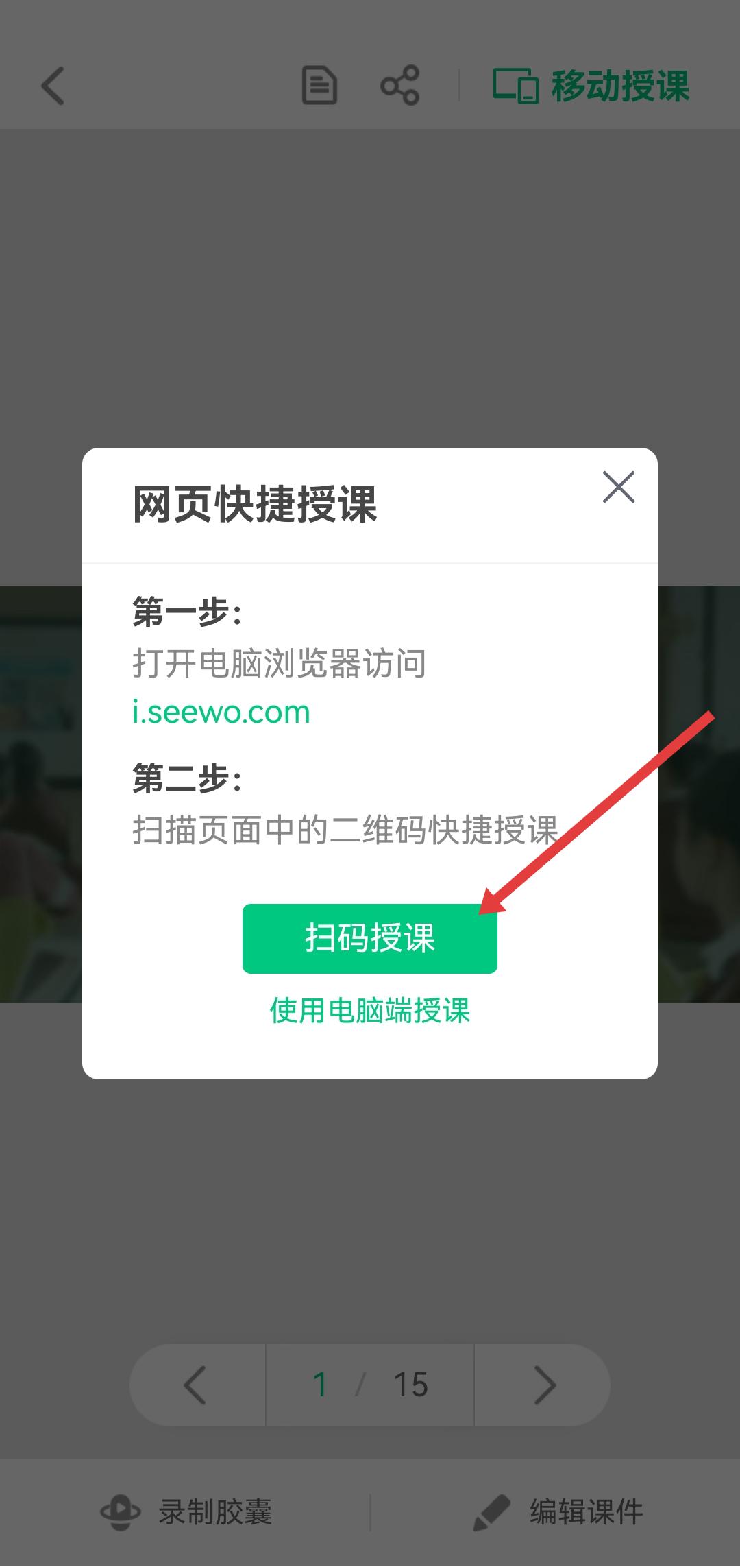 4、在網(wǎng)頁(yè)快捷授課彈窗中,點(diǎn)擊掃碼授課,然后用手機(jī)掃描電腦端頁(yè)面的二維碼,即可開始移動(dòng)授課。