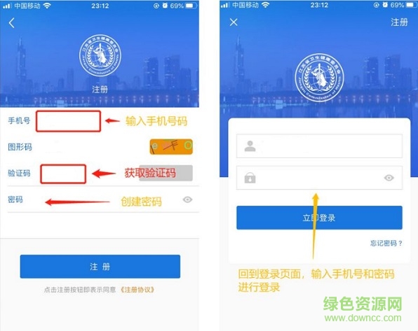 2、跳轉(zhuǎn)注冊頁面,填寫手機(jī)號、短信驗(yàn)證碼和和密碼進(jìn)行注冊,然后返回登陸界面登陸。