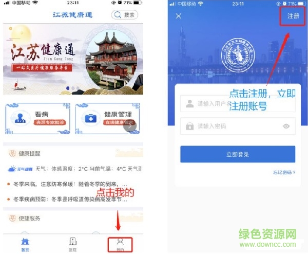 1、打開江蘇健康通APP,點(diǎn)擊我的選項(xiàng)。