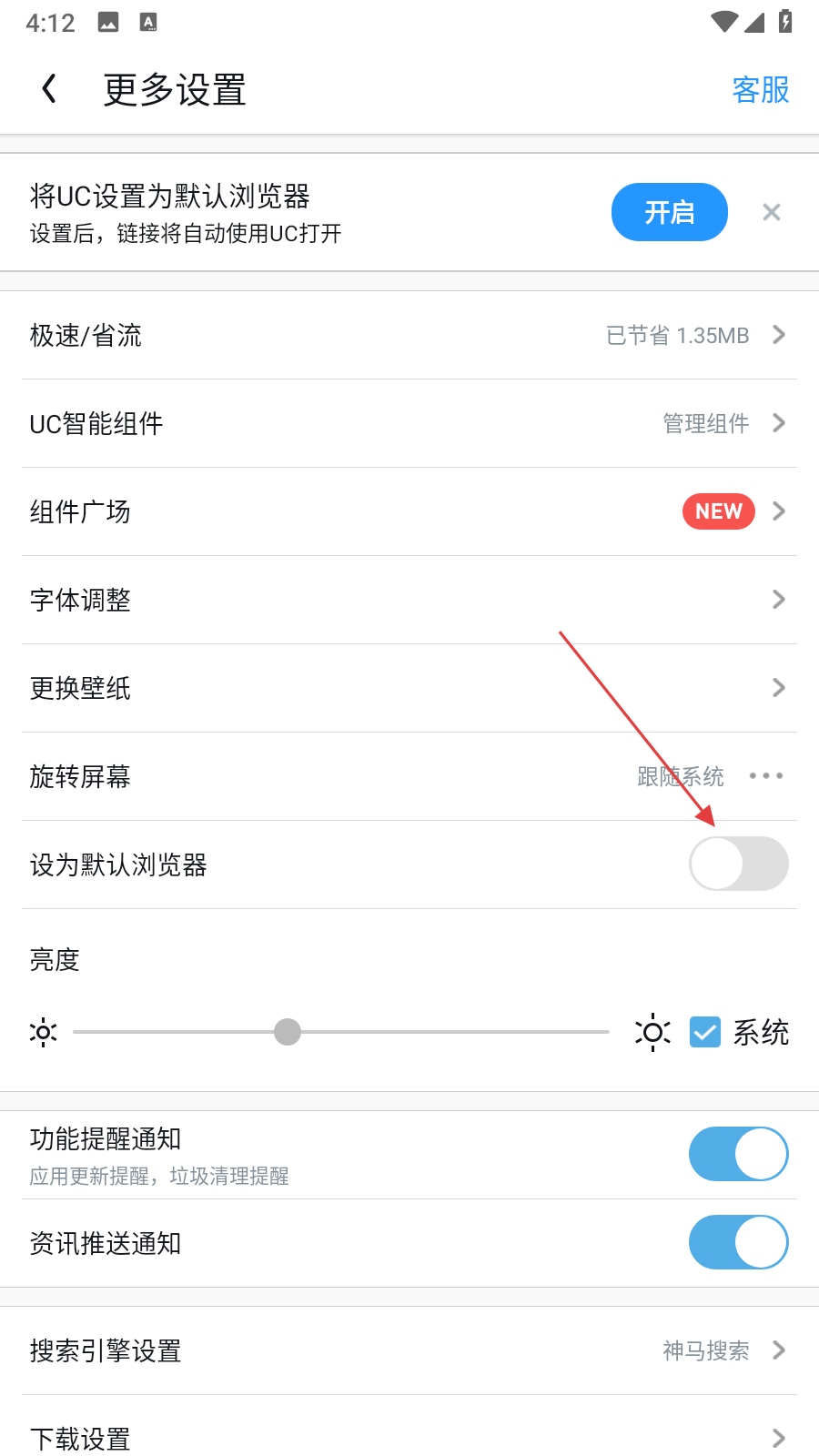 2、在更多設(shè)置頁面中找到設(shè)為默認(rèn)瀏覽器選項(xiàng),點(diǎn)擊其右側(cè)開關(guān)按鈕。