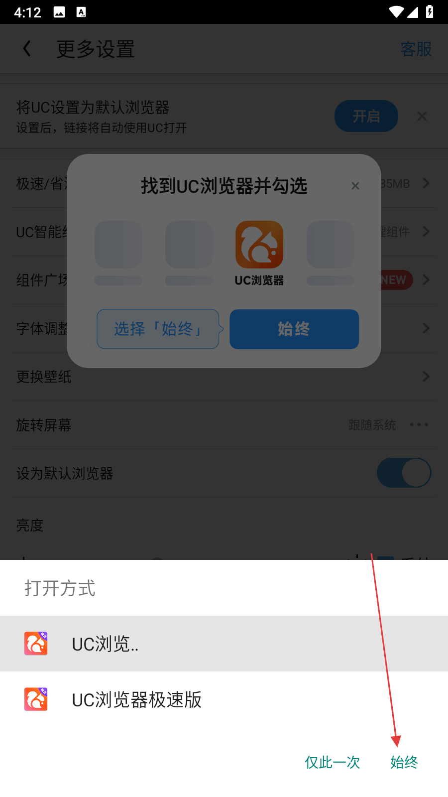 3、在彈出的打開方式選擇界面中,找到UC瀏覽器極速版,點(diǎn)擊始終按鈕,即可將UC瀏覽器極速版設(shè)為默認(rèn)瀏覽器。