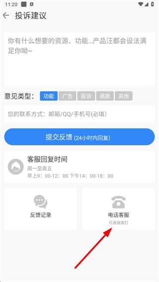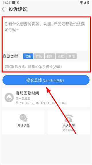 3、進(jìn)入頁面后,在上方文本框輸入想要反饋的內(nèi)容,選擇意見類型,填寫聯(lián)系方式,點(diǎn)擊提交反饋按鈕。