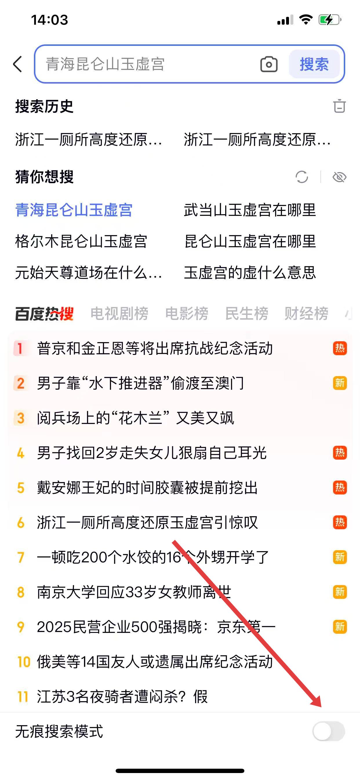 2、在搜索界面,向下滑動,找到無痕搜索模式開關(guān)。