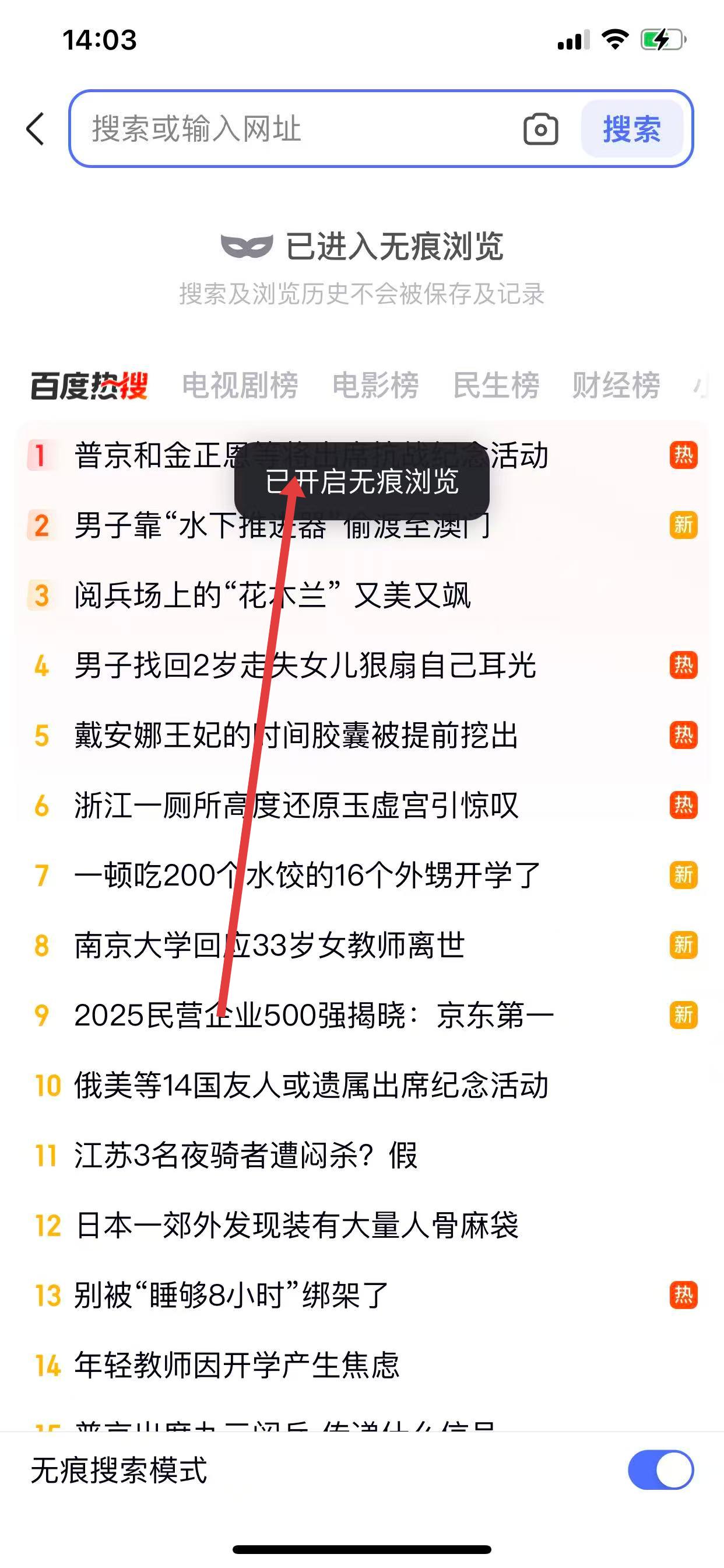 3、點(diǎn)擊無痕搜索模式開關(guān),提示已開啟無痕瀏覽,開啟后搜索及瀏覽歷史不保存記錄。
