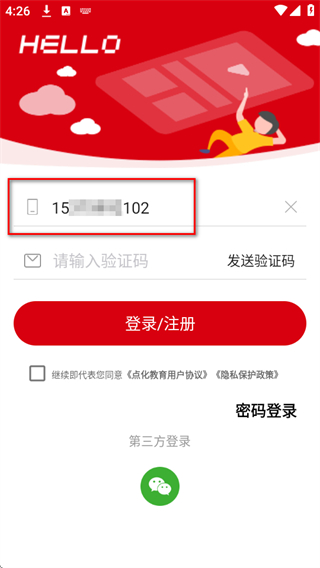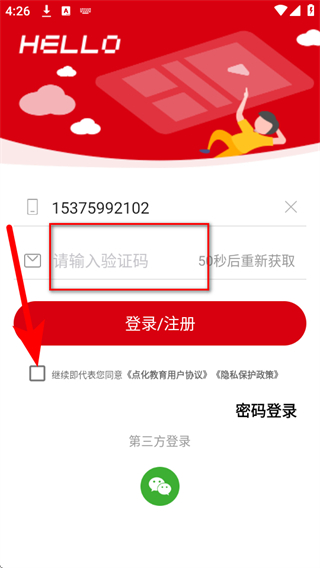 3、點(diǎn)擊發(fā)送驗(yàn)證碼按鈕,輸入收到的驗(yàn)證碼,勾選繼續(xù)即代表您同意點(diǎn)化教育用戶協(xié)隱私保護(hù)政策。