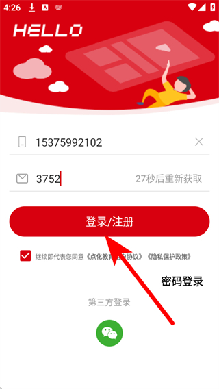 4、點(diǎn)擊登錄/注冊(cè)按鈕,即可完成登錄若為新用戶,此操作同時(shí)完成注冊(cè)。