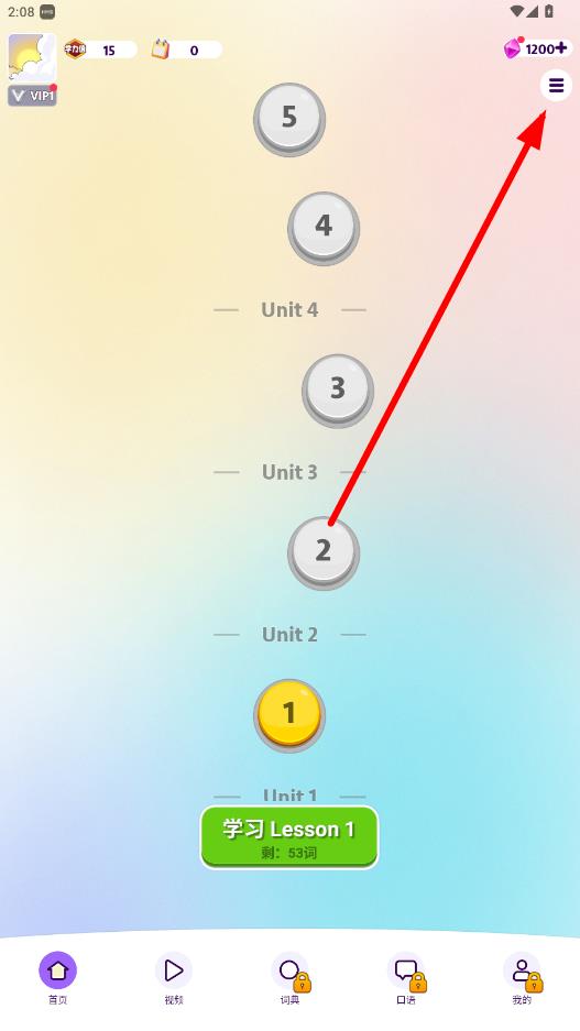 1、打開(kāi)傻瓜英語(yǔ)app,在主界面點(diǎn)擊右上角三橫線(xiàn)圖標(biāo)進(jìn)入設(shè)置。