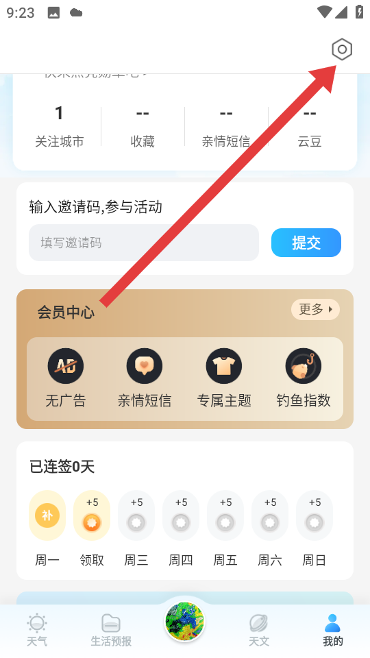 1、打開最美天氣APP,進(jìn)入我的頁面,需要點(diǎn)擊右上角六邊形設(shè)置的圖標(biāo),進(jìn)入設(shè)置的界面。