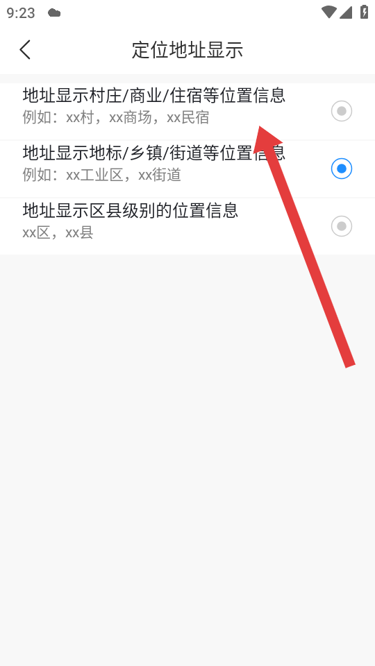 3、在定位地址顯示頁面,選擇地址顯示村莊/商業(yè)/住宿等位置信息的這個(gè)選項(xiàng),就能將定位精確到村子級別。
