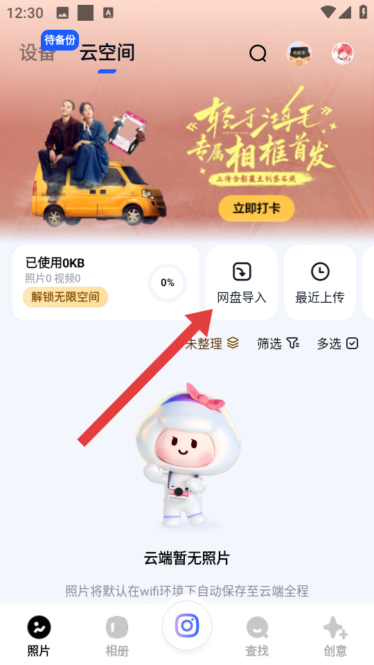 1、打開一刻相冊APP,切換到云空間頁面,點擊網(wǎng)盤導(dǎo)入按鈕,進入百度網(wǎng)盤文件選擇界面。