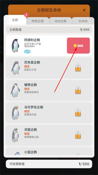 4、進(jìn)入企鵝和生命體界面,消耗金幣解鎖阿德利企鵝增加產(chǎn)量。