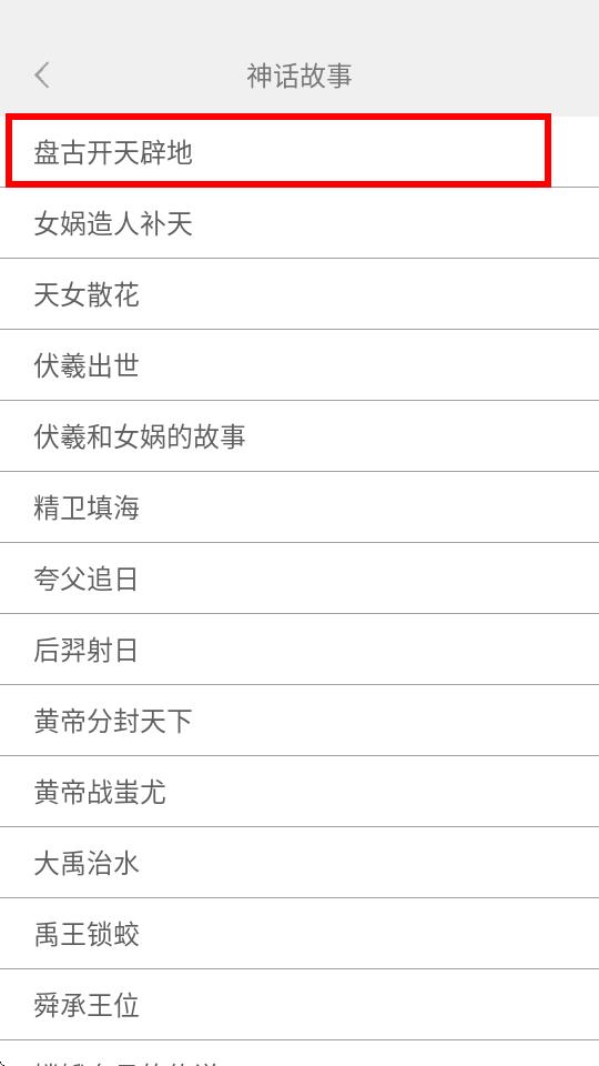 3、點(diǎn)擊具體類別后,比如選擇神話故事,會(huì)展示該類別下的故事列表,選擇想聽或想看的故事,如盤古開天辟地。