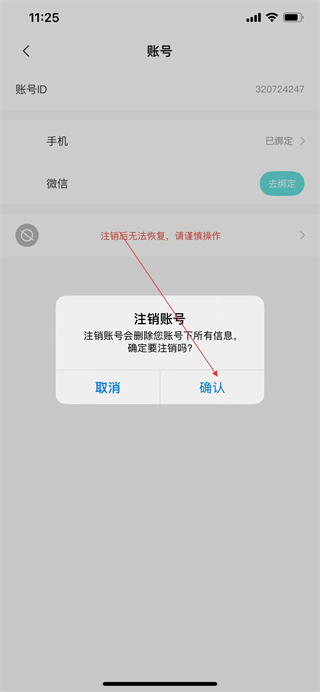 5、在彈窗中點(diǎn)擊確認(rèn)按鈕,完成賬號注銷操作。