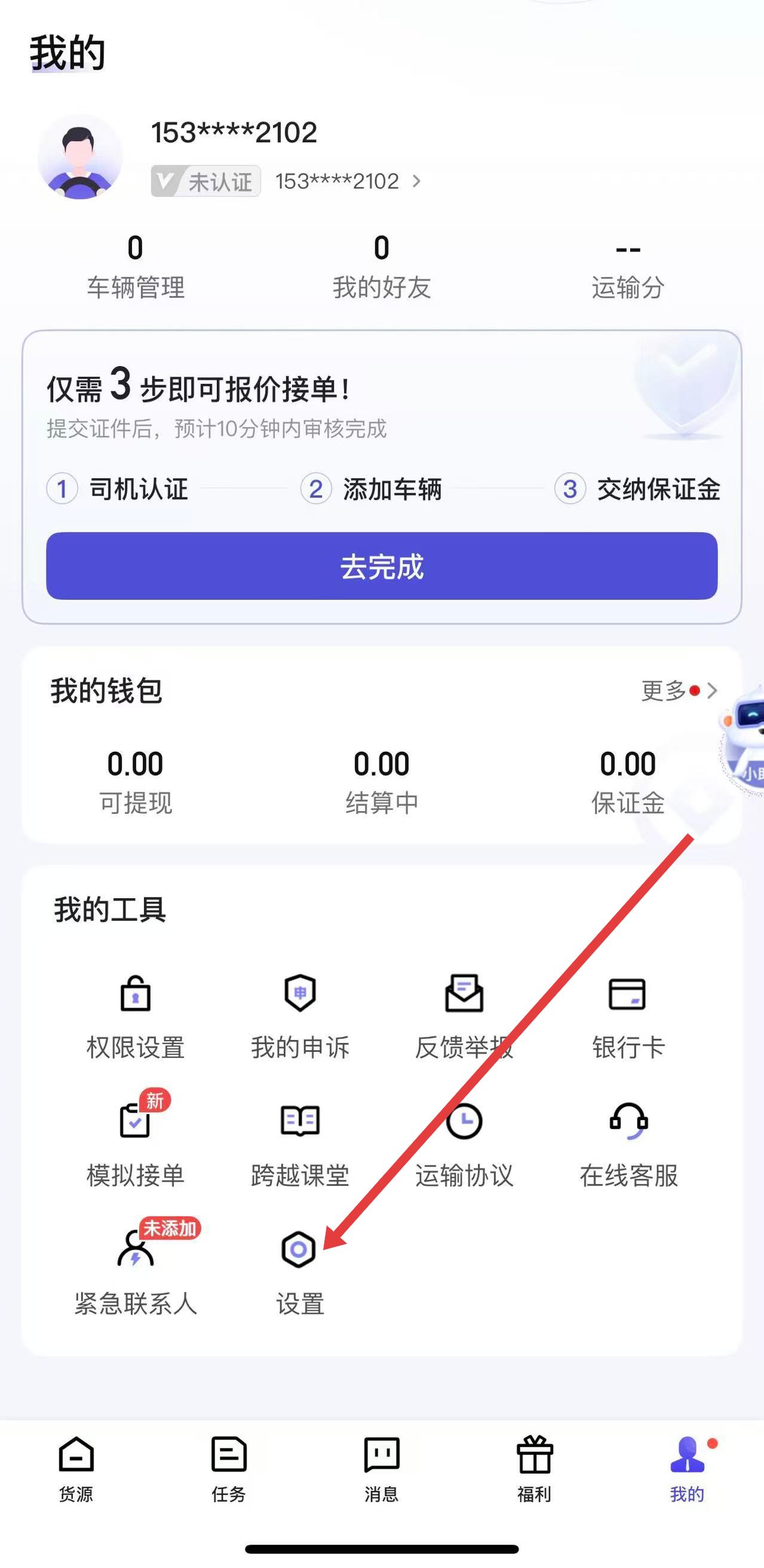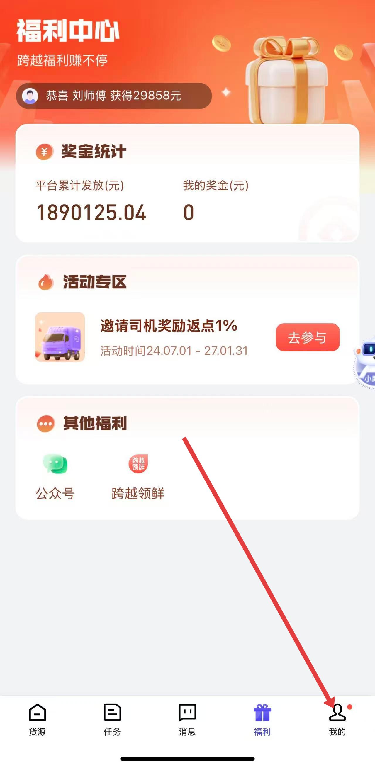 1、打開(kāi)跨越運(yùn)力app,點(diǎn)擊底部導(dǎo)航欄中的我的選項(xiàng),進(jìn)入個(gè)人頁(yè)面。