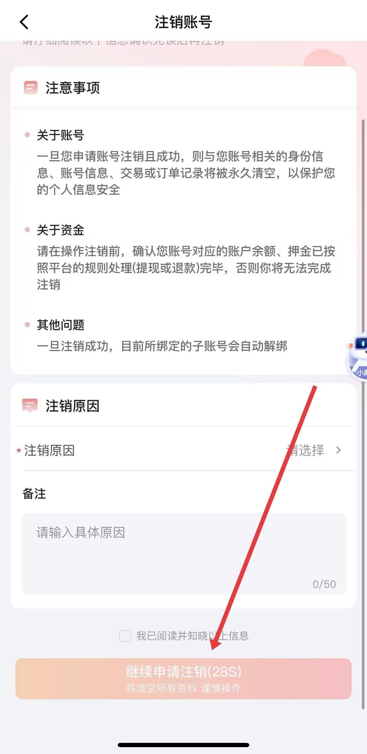 4、在注銷(xiāo)賬號(hào)頁(yè)面,仔細(xì)閱讀注意事項(xiàng),選擇注銷(xiāo)原因,然后點(diǎn)擊繼續(xù)申請(qǐng)注銷(xiāo)按鈕,按照后續(xù)提示完成注銷(xiāo)操作。
