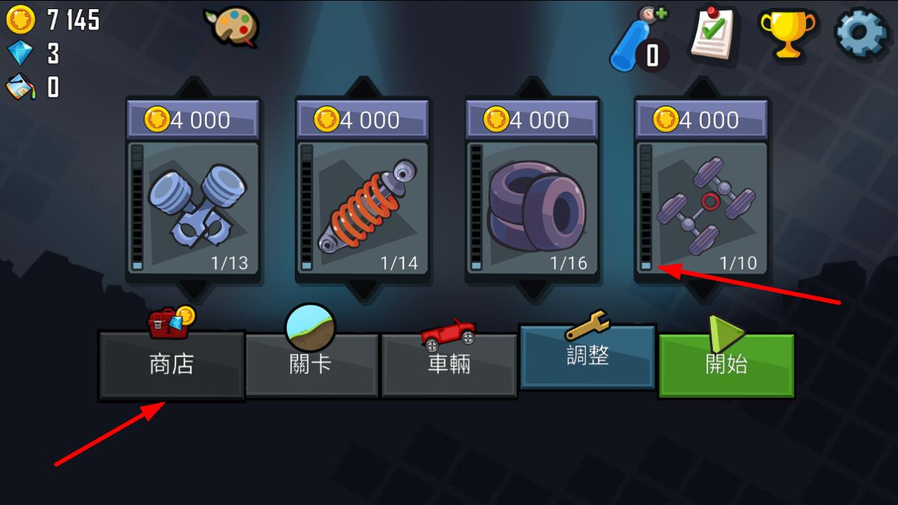 1、進入游戲主界面,若想提升車輛性能,可以點擊商店,花費金幣購買如活塞、彈簧、輪胎等零件 ,為后續(xù)挑戰(zhàn)關卡做好準備。