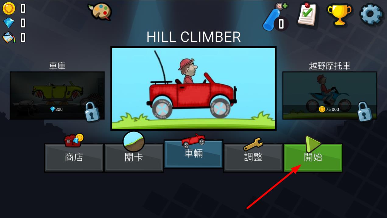 2、選擇自己心儀的載具,或者花費鉆石、金幣解鎖如越野摩托車等更多車輛,選好車后,點擊開始按鈕進入關卡挑戰(zhàn)。