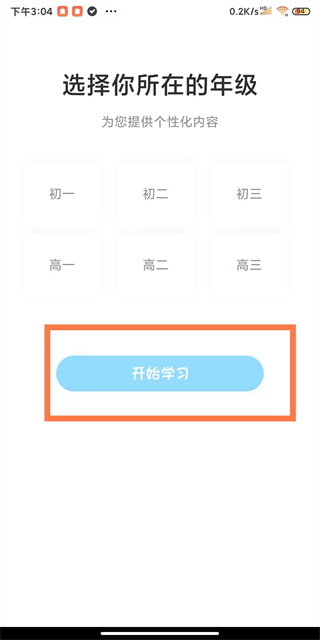 4、登錄后選擇所在年級,點擊開始學習按鈕,即可完成登錄流程。