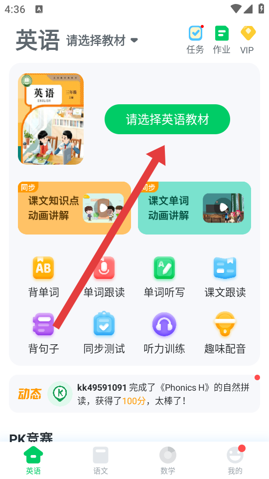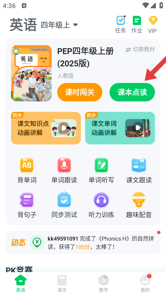 3、教材選擇完成后,返回英語界面,點擊課本點讀按鈕,進入課本內(nèi)容頁面。