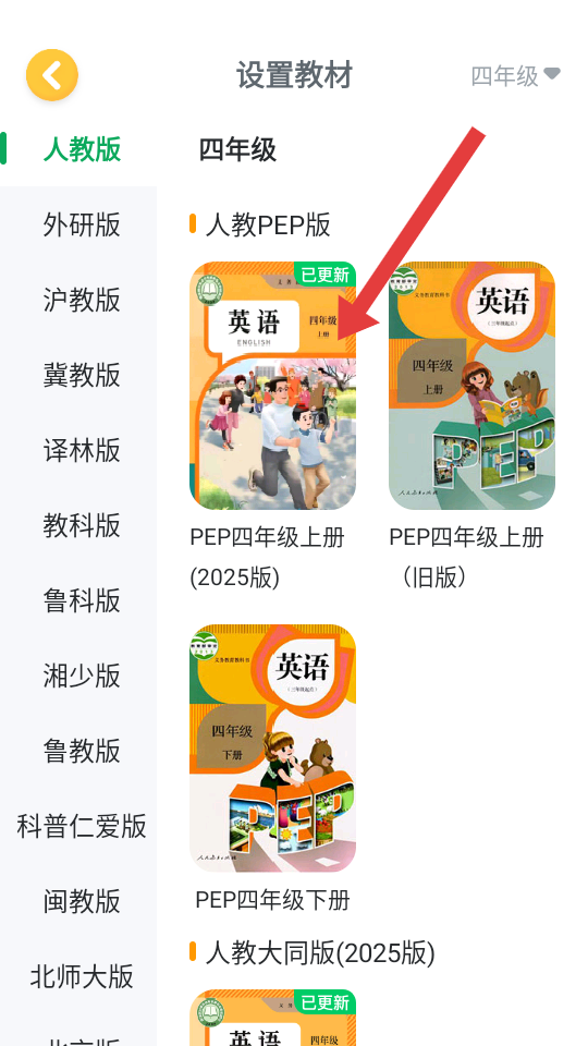 2、在設(shè)置教材的頁面,我們需要選擇對應(yīng)的年級和教材的版本。