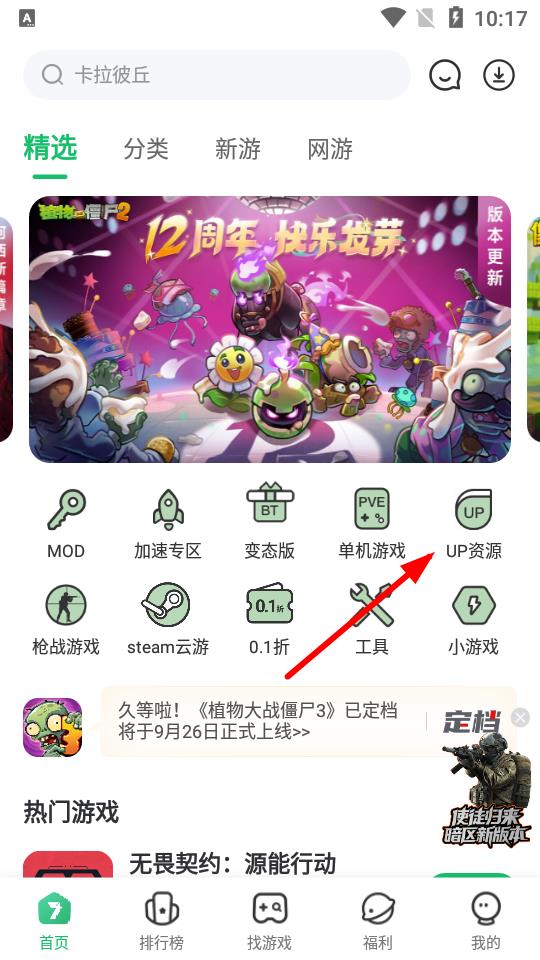 2、在首頁(yè)界面中,找到UP資源選項(xiàng)并點(diǎn)擊進(jìn)入U(xiǎn)P資源頁(yè)面。