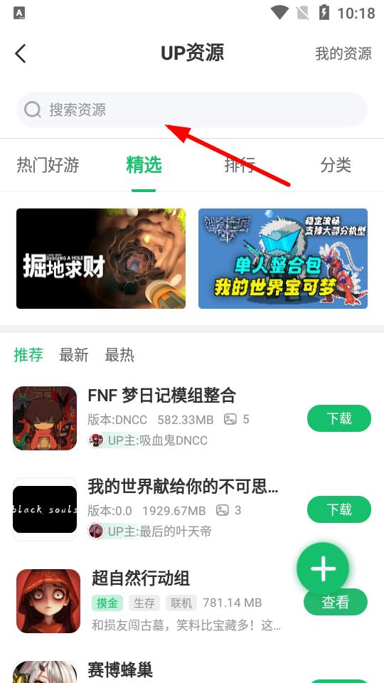 3、在UP資源頁(yè)面上方的搜索欄中,輸入想要查找的資源名稱,即可搜索相關(guān)游戲資源。