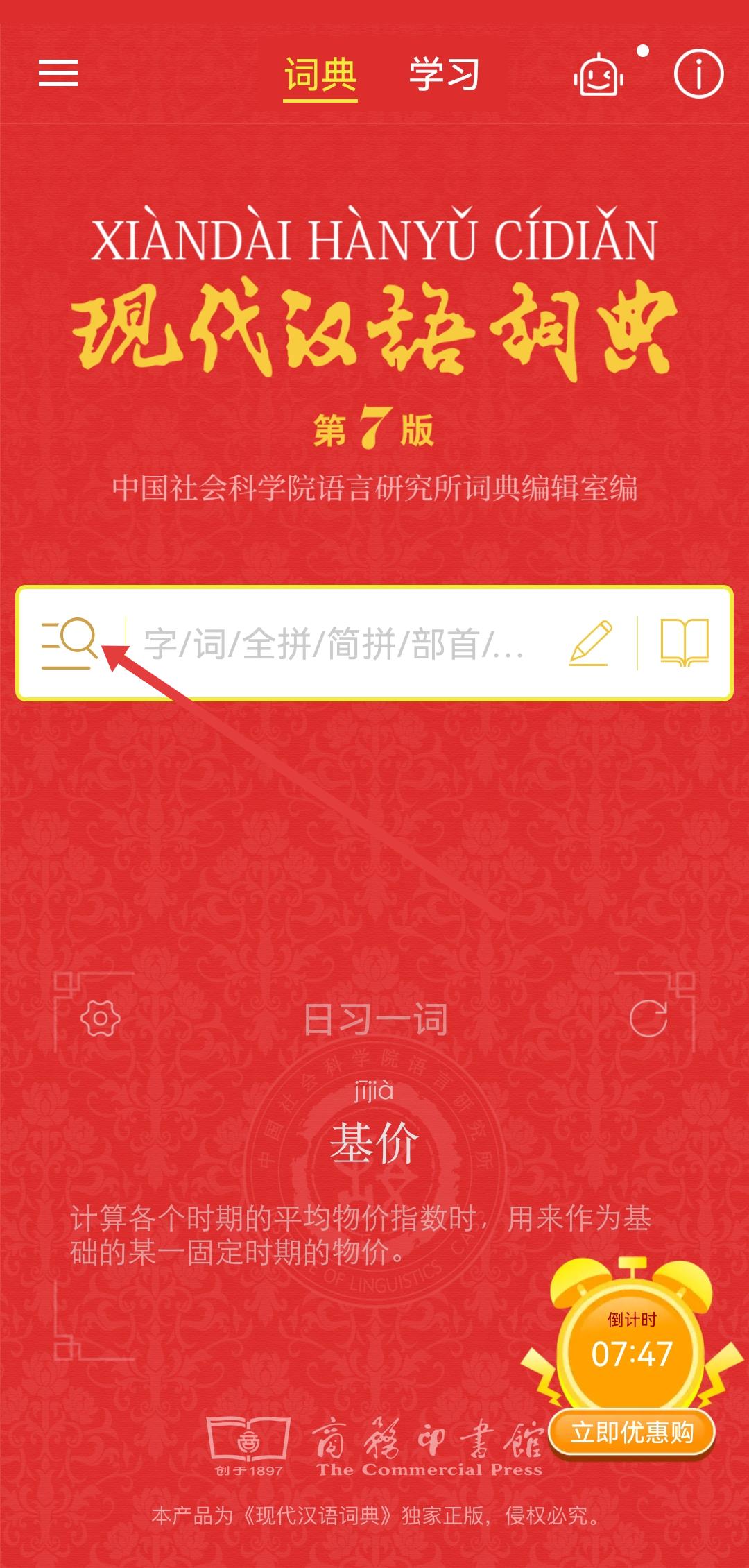1、打開現(xiàn)代漢語詞典APP,點擊主界面的搜索框,進入搜索的頁面。