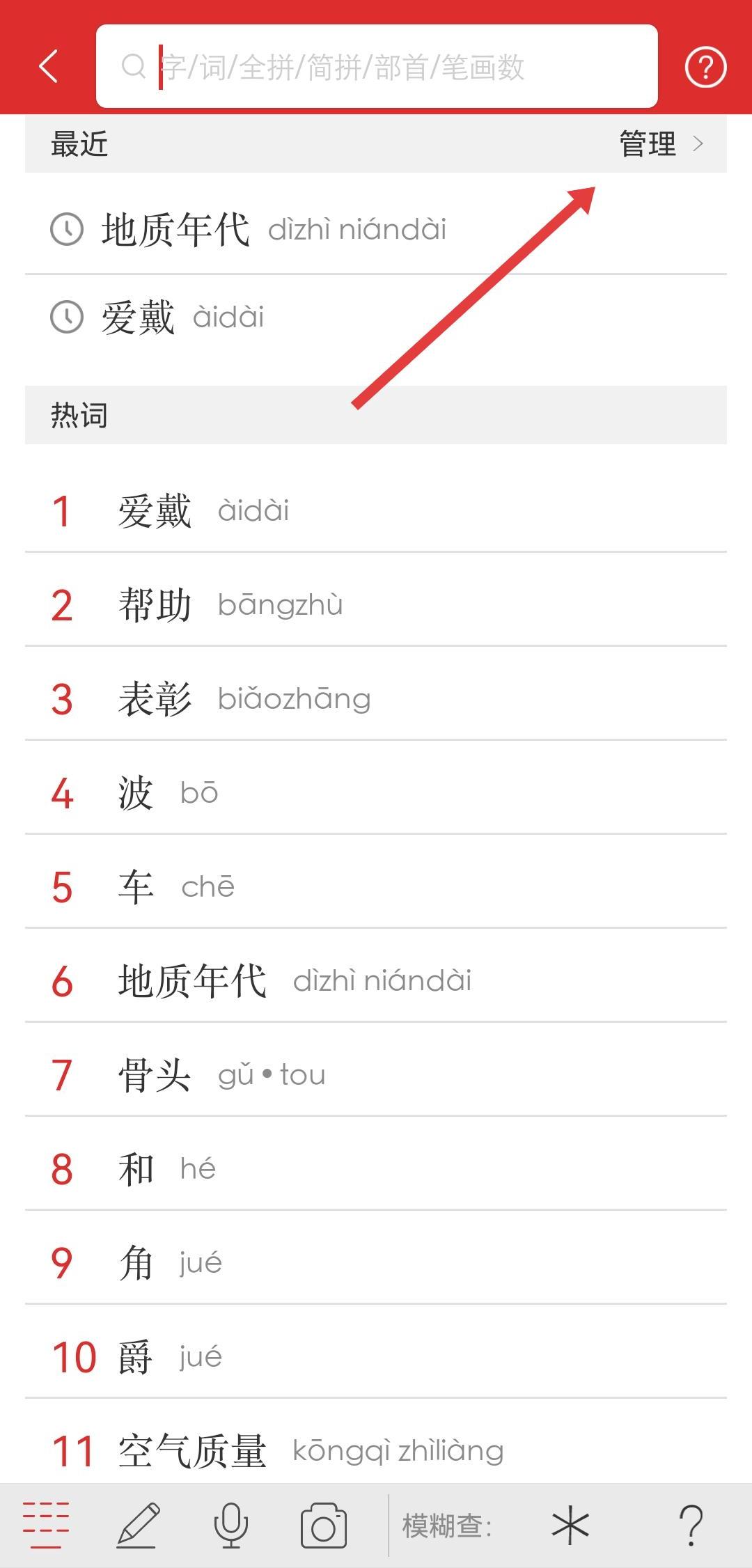 2、在搜索頁面中,點擊最近查詞區(qū)域右上角的管理按鈕,進入查詞歷史頁面。