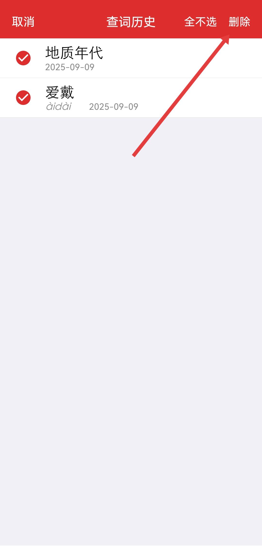 4、選擇需要刪除的查詞歷史記錄,然后點擊右上角的刪除按鈕,完成查詞歷史記錄的刪除。