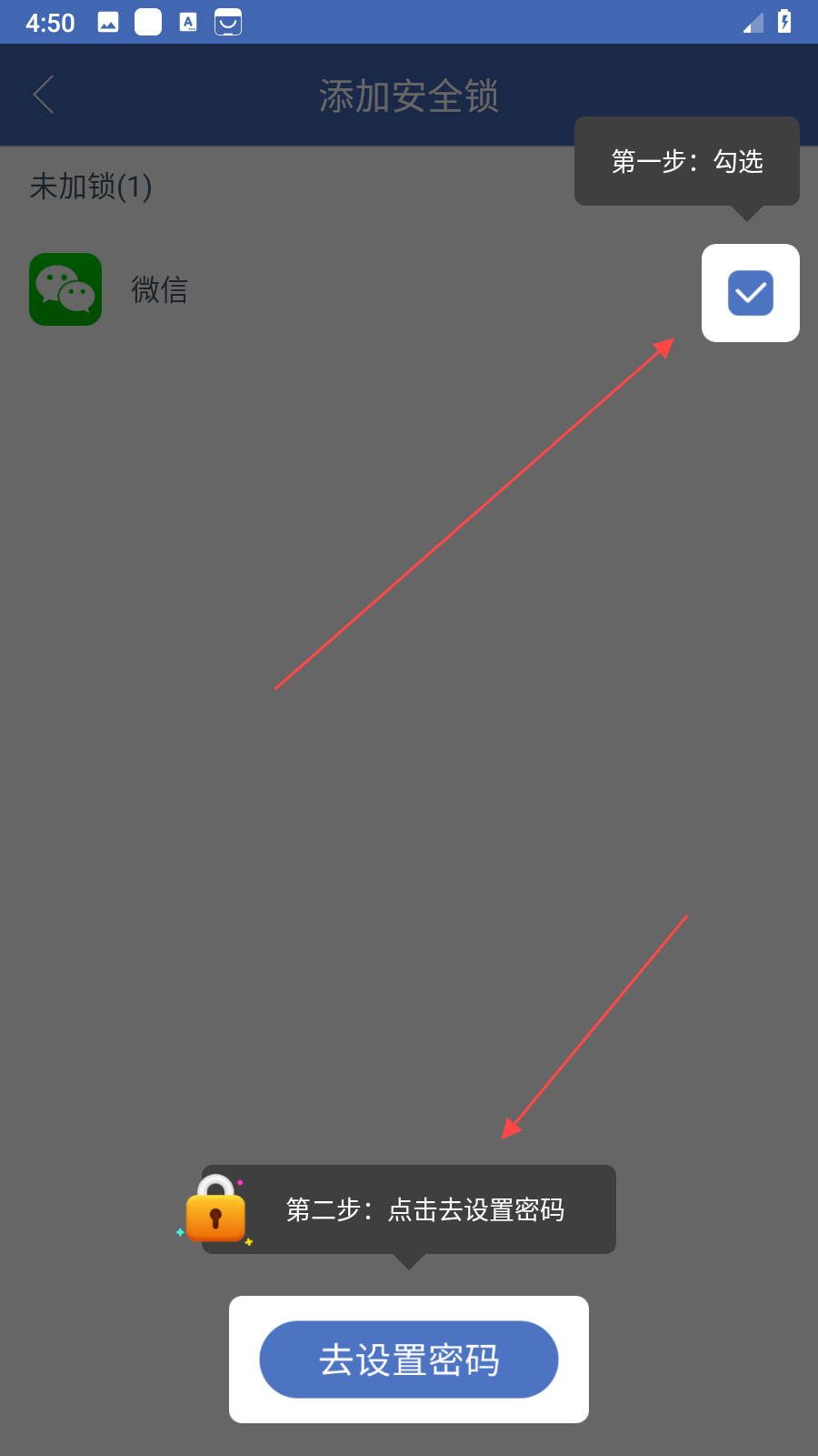 1、打開雙開助手進(jìn)入個人中心,找到應(yīng)用加鎖選項并點擊,跳轉(zhuǎn)至添加安全鎖頁面,在未加鎖應(yīng)用列表里勾選想要加密的應(yīng)用,勾選后點擊下方去設(shè)置密碼按鈕。