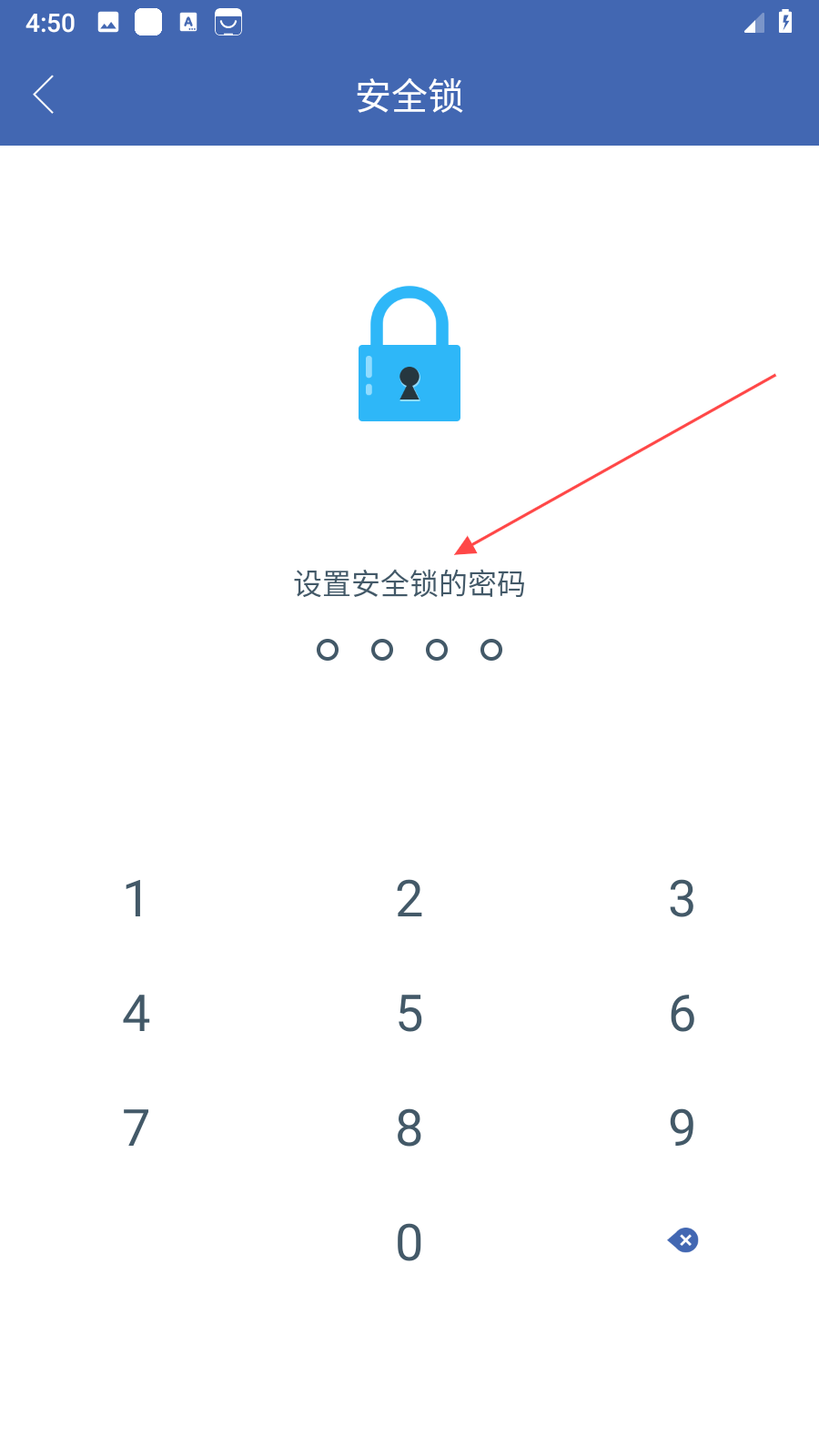 2、進(jìn)入安全鎖設(shè)置頁面,通過數(shù)字鍵盤輸入設(shè)定的密碼,完成密碼設(shè)置后,加密應(yīng)用的初步流程結(jié)束,后續(xù)開啟加密應(yīng)用的雙開分身需驗證此密碼。