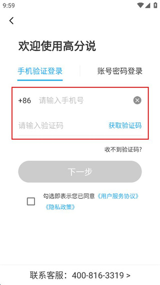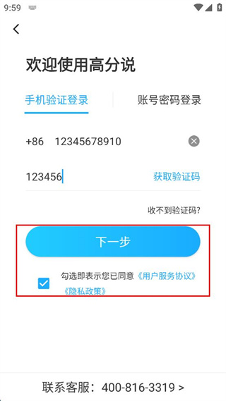 4、填寫驗證碼,勾選同意用戶服務協(xié)議和隱私政策,點擊“下一步”完成登錄。