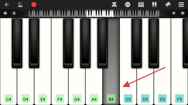 3、直接用手指點擊屏幕上的白色琴鍵或黑色琴鍵,每個鍵對應鋼琴的一個音符,擊后會發(fā)出對應音高的聲音。