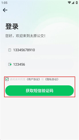 4、勾選請(qǐng)閱讀并同意用戶(hù)協(xié)議和隱私協(xié)議,點(diǎn)擊獲取短信驗(yàn)證碼。