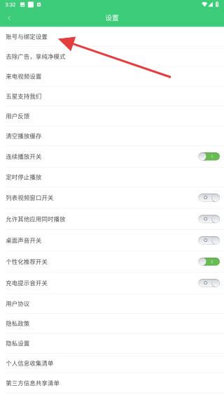 3、在設(shè)置頁面中,點擊賬號與綁定設(shè)置的選項。