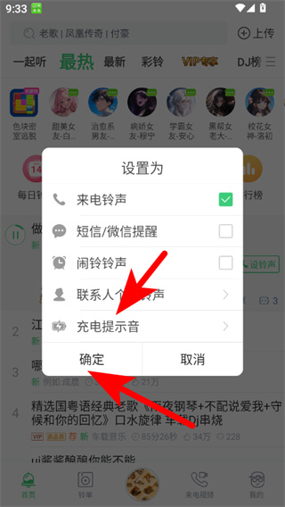 3、選擇充電提示音選項,選擇充電提示音后點擊確定,即可完成充電提示設(shè)置。